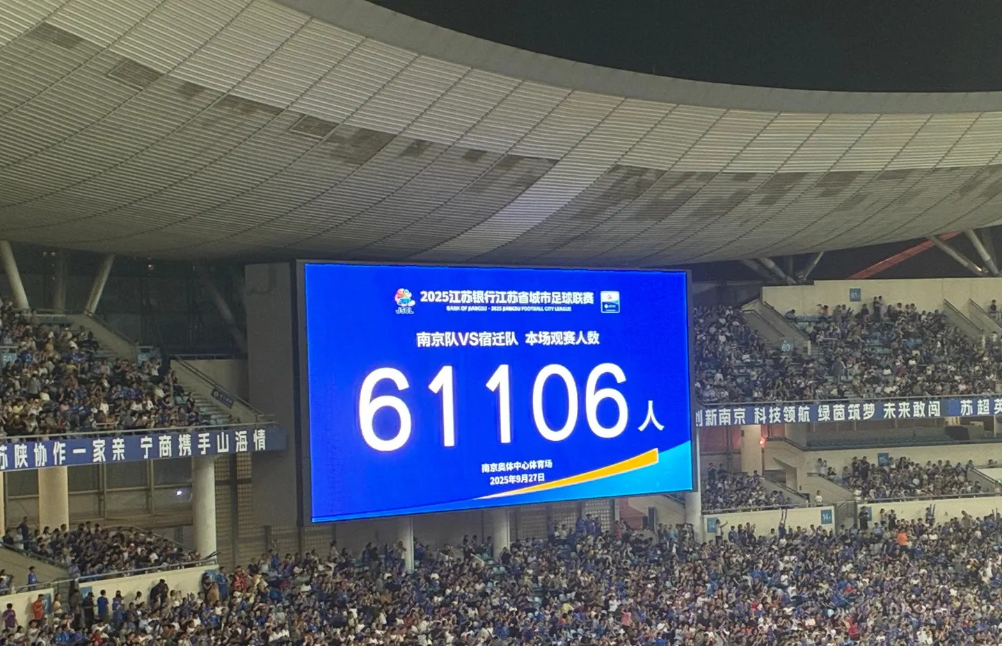 据现场MC播报,南京与宿迁的比赛,共有61106名球迷涌入南京奥体,共同观看比赛,再一次刷新苏超现场观赛人数纪录。此前,苏超第11轮,南京队坐镇主场迎战徐州,有60817名球迷来到南京奥体中心体育场现场观战。再之前,南京奥体先后有60396和60633名球迷现场观看苏超。