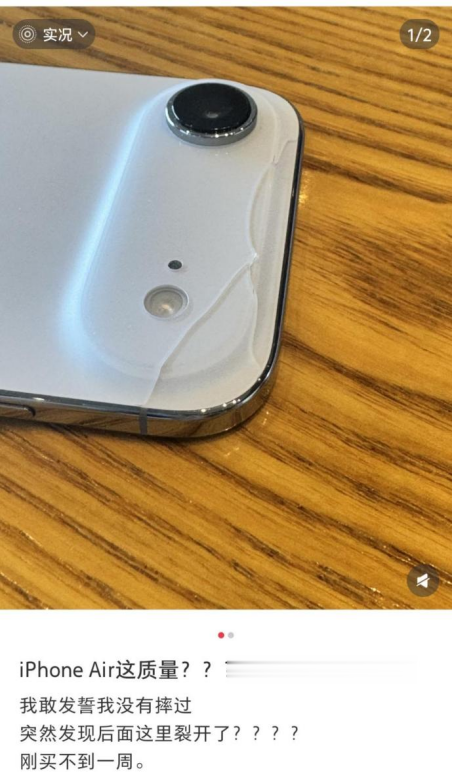 不过,主打轻薄的iPhoneAir的用户反馈也两极分化。在社交媒体上,有用户总结称,手感确实很好,但为了轻薄也牺牲了很多配置,比如只有单扬声器,音质差、音量小;电池小、续航一般。另外,还有多位用户吐槽,iPhoneAir的后盖比较脆弱,在没有经受很大磕碰的情况下出现了后盖碎裂。